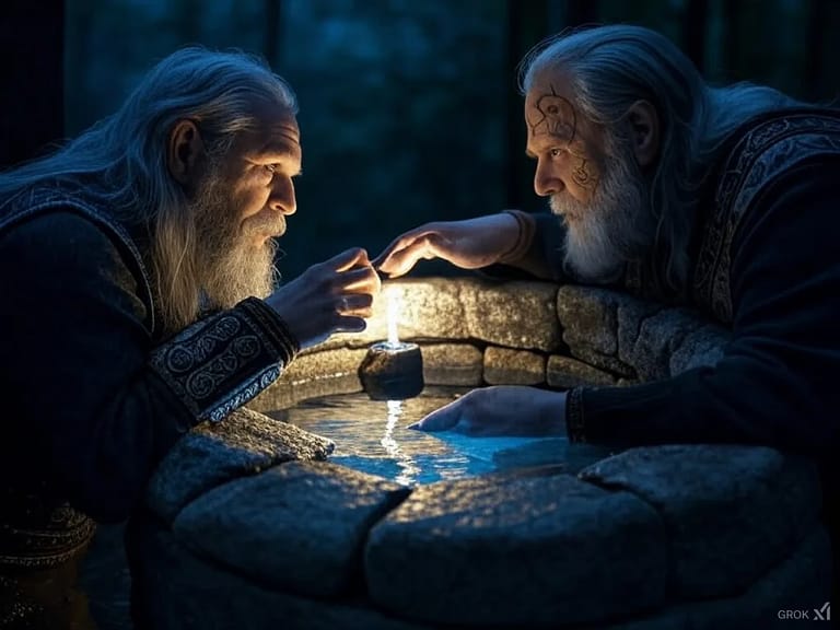 Odin, evrenin en derin sırlarını ve bilgeliğini içinde saklayan Mimir’in kuyusunu duymuştu. Bu kuyu, Yggdrasil’in köklerinden birinde, gizli bir ormanda bulunuyordu. Mimir, bilgelik kuyusunun bekçisiydi ve içine düşen her damla su, bilgi ve anlayışla doluydu. Ancak, bu suyun tadına varmak isteyen herkesten büyük bir bedel talep ederdi.